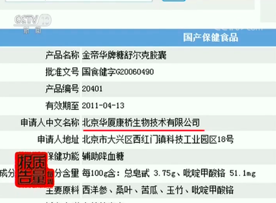 记者注意到,李先生从网上购买的所谓"仁合胰宝",批准文号为国食健字G20060490。然而记者登录原国家食品药品监督管理总局官方网站查询却发现,这一批准文号对应的产品名称为金帝华牌糖舒尔克胶囊,由北京华夏康桥生物技术有限公司于2006年4月14日申请所得。