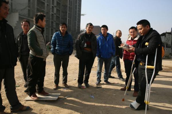 河北定州胜利街建华社区的一个工棚内,重庆涪陵籍农民工赵家友拄着拐杖目光沉重地望着窗外被雾霾笼罩的天空。因为合伙承包的定州市东明家具城商业楼项目885.9万元工程款被拖欠,去年10月22日他带工人讨要工程尾款时遭追打,赵家友的腿被开发商定州市丰源房地产开发有限公司(以下简称:丰源房地产公司)工作人员打骨折。