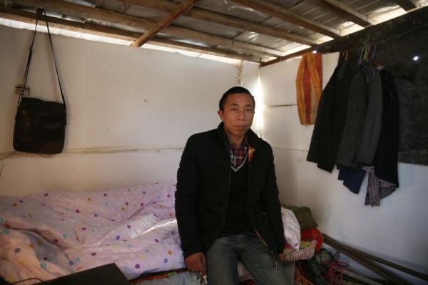 41岁的工人石纪斌在四处透风的工棚内住着,希望今年不要空手回家。