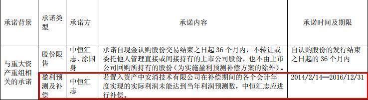 按照中安消此前的盈利预测以及承诺,中安消重组注入的标的资产中安消技术有限公司在2014、2015、2016年的净利润分别为2.1亿元、2.82亿元和3.76亿元;并承诺若置入资产未能达到利润预测数,将进行补偿。