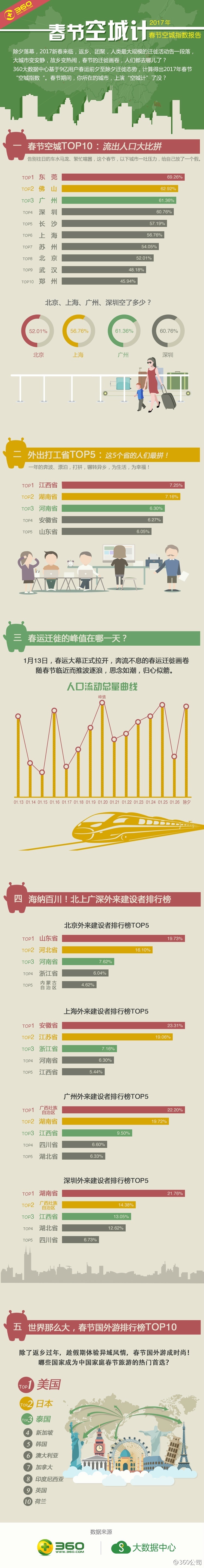 【春节迁徙大数据:春节最空的空城竟然不是北京?!】春节期间,你所在的城市,上演"空城计"了没?据360大数据中心显示,春节空城指数排行前3名的城市分别是东莞、佛山和广州;北上广深分别空了61.36%、60.76%、56.76%和52.01%。根据春运至春节迁出人口计算,江西,湖南,河南的人们外出打工最拼。(编辑:映雪)
