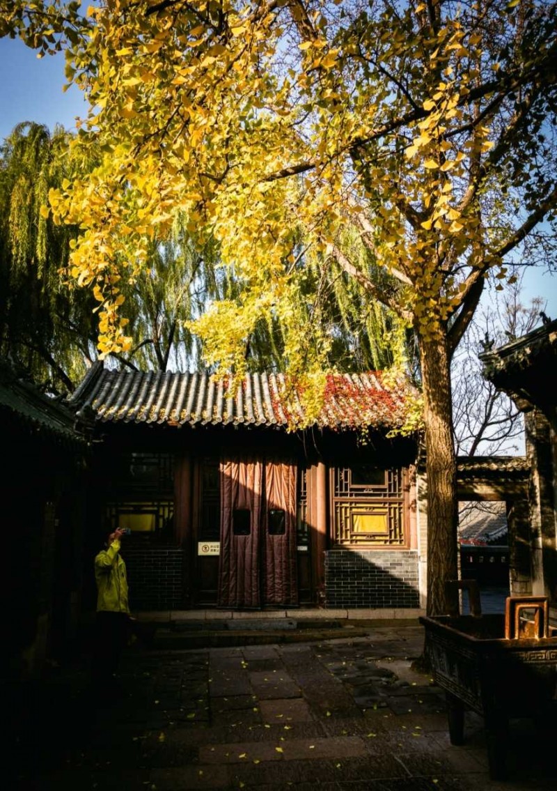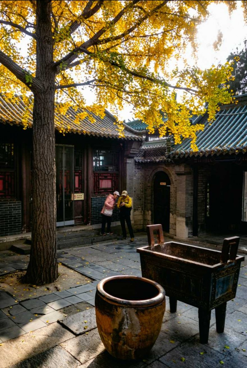仰头望去,满眼皆是撞入心底的景致。银杏叶黄得热烈而纯粹,像浸了暖阳的蜜,沉甸甸地挂在枝头,风一吹便簌簌轻摇;黛色的瓦当整齐排列,黑得沉静而厚重,藏着老建筑的沧桑与沉稳;澄澈的天空蓝得干净透亮,像被洗过一般,没有一丝杂质。黄的鲜活、黑的沉稳、蓝的澄澈,这般浓烈地交织在一起,倒像是谁随心挥毫,用彩笔狠狠抹了几笔,浓得化不开,艳得动人心。这般撞色的景致,何尝不是生活的隐喻?生活从不是单一的色调,有热烈的欢喜,也有沉静的淡然;有绚烂的高光,也有平凡的日常。我们总在追寻极致的美好,却不知美好本就藏在这多元的碰撞里,藏在这寻常的景致中。