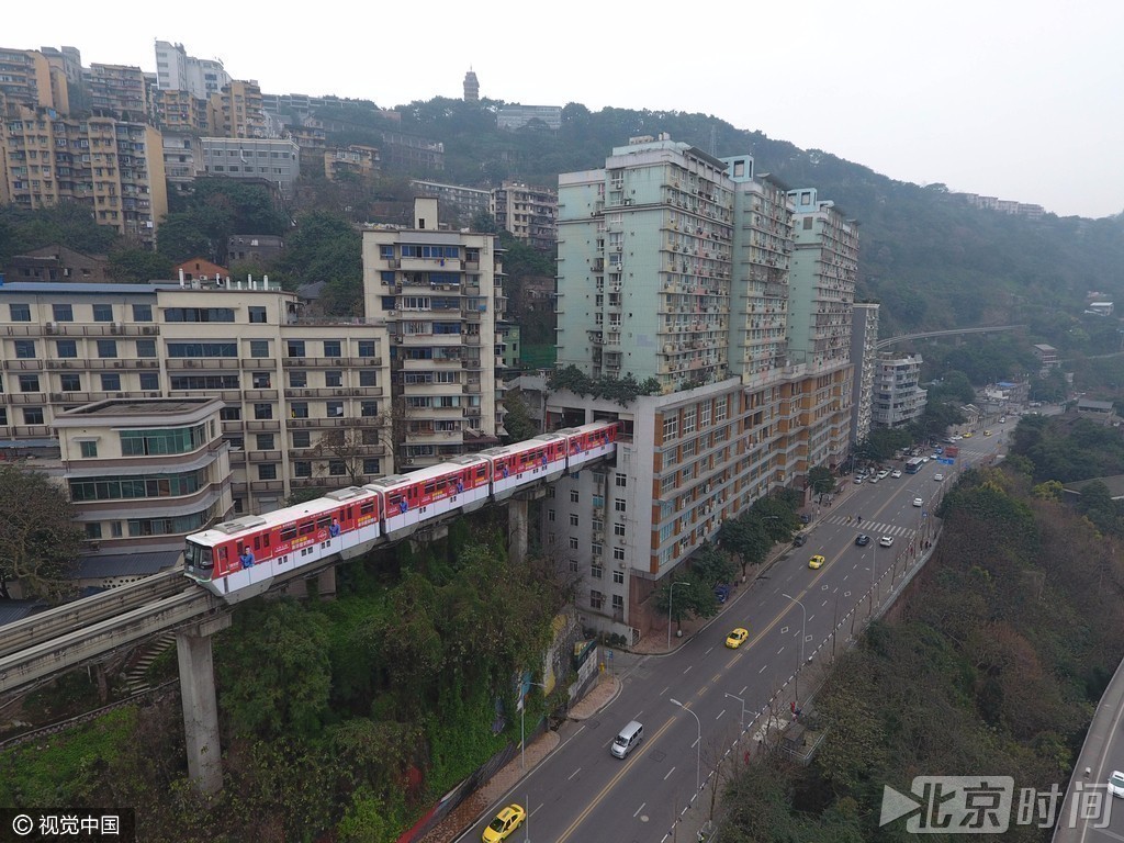 2017年3月18日,重庆,轻轨2号线在李子坝站“穿”居民楼而过,山城的复杂地形造就了全国绝无仅有的震撼景象。