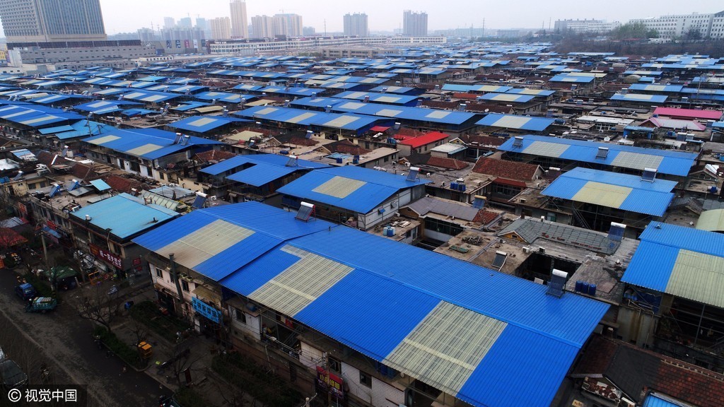 2017年03月24日,山东省济南市,在历山北路中段的黄台社区魏家庄,数百座二层小楼的顶部,居民自费安装了蓝色彩钢板和灰白色透明采光窗,用于防晒和防雨。
