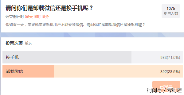 知名财经科技自媒体向小田在微博发起网友调查显示,如果有一天苹果无法使用微信,七成用户选择换手机,三成用户选择卸载微信。