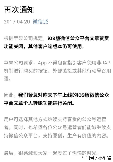 4月19日下午,微信官方宣布,受苹果公司新规定影响,2017年4月19日17点起,iOS版微信公众平台赞赏功能关闭,用户可通过二维码方式转账。安卓等其他操作系统的微信的赞赏功能不受影响。不过20日凌晨,微信再次通知,iOS版微信二维码打赏方式也被禁止。
