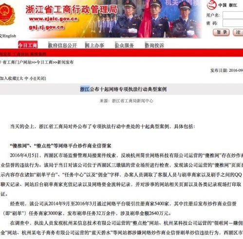 9月27日消息,浙江省工商局日前公布了十起网络专项执法行动典型案例,其中包括“傻推网”、“整点抢”等网络平台炒作商业信誉案。